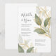 Den vackra löven med vattenfärg parad med guld färg lämnar rubrik i den moderna bröllopsinbjudan.