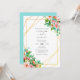 Den här chicens bröllopsinbjudan är perfekt för målbröllop i lush, tropiska språkinställningar. I inbjudan till elegant finns en söt guld ram som har dekorerats med tropiska buketter. Vattenfärgsbouqueterna omfattar rosa hibiscus, korall och fuchsia plumeria och söt emerald grey. Kortets baksida är en underbar skugga av turkosa blått. Matchande bröllop-kontorsmaterial finns i vår samling av Tropical Blommigt bröllop.