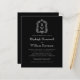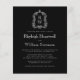 Den här vintage-inspirerade bröllopsinbjudan innehåller ett par vitt initialer med monogram i ett öppet serif-teckensnitt ovanför och under en skiljelinje och omges av en botanisk vapensköld på en svart bakgrund. Kortets baksida är starkt svart.