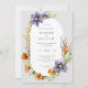 Inbjudan till elegant bröllop som innehåller en kaskad av blått/lila clematis, formblått och grönt löv, arrangerad i ett avlångt ram med dekorativa vingar.