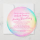 Vacker, stiliserad, färglös bakgrundsbild av vattenfärgsbubblor på ett runt bröllopsinbjudningskort i söt pastellskuggor av rosa, orange, blått, grönt aka, gult och lila. Redigera den här inbjudan med ditt eget ord. Unik design och vattenfärgsmålning från Sarah Trett.