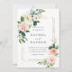 Bröllopsbjudan har färgade vattenfärgblommor i rosa, vit och grönt med guld ramar. Om du vill ha en mer avancerad anpassning av den här designen klickar du på knappen Anpassa. Matchande objekt är också tillgängliga.
