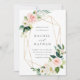 Bröllopsbjudan har färgade vattenfärgblommor i rosa, vit och grönt bladverk med guld geometrisk ram. Om du vill ha en mer avancerad anpassning av den här designen klickar du på knappen Anpassa. Matchande objekt är också tillgängliga.