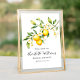 Elegant vattenfärg citron-tema bröllochsbrunch välkomstskylt eller -affisch som du kan rama in med en blomsterillustration och teal bakgrund. Anpassa texten med dina festsdetaljer.