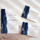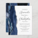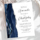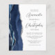 Den moderna bröllopsinbjudan från elegantens lämnat kant har en marin blå vattenfärgsagat gräns som trimmas med faux silver glitter. Anpassadet kombinerar grått-skriptet för kol och sans serif typsnitt på vit bakgrund. Den omvända sidan har en matchande marin blå och silver-agate-design.