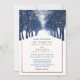 Anpassa den här underbara snyggten moderna vinterbröllopsinbjudan med en originalbild av en marin blå vinterplats i Träd som är designad med en kombination av faux koppar och ram och vitt färg. Observera att koppar är ett färg-tryck och inte en metallfolie. Den här versionen har namn på koppar färg.