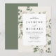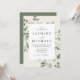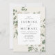 Den vita bröllopsinbjudan till elegant blommigt innehåller dina namn- och bröllop-detaljer som är ramade av färgade eucalyptus löv, lush grönt foliage, vit och kräm ro och lisianthus blommor.