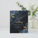 Den här inbjudan från elegant bröllop innehåller marina blåa blommigtar som är utgivna med guld faux foil grey i två hörn, på en bakgrundsbild av marin blått vattenfärgsagat. Anpassadet kombinerar guld-färgad serif, italic och handskriftsformat typsnitt. På baksidan finns utrymme för information om bröllop, tillsammans med en QR-kodgäst som kan söka på webbplatsen och OSAN, vilket sparar kostnaderna för utskrift och utskick av separat OSA kort.