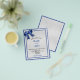 Observera att inbjudan är papper och mycket tunn. Kuvert ingår inte. Om du vill ha mer omfattande inbjudningar (samma design) kan du besöka vår butik. En modern elegant- och bröllopsinbjudan. Faux silver tittar bakgrund som dekorerats med royal blå ramar och båge. Anpassa och lägg till information om namn och bröllop. Svart och blå färgad brev.
