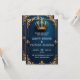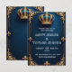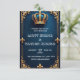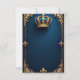 Elegant-bröllopsinbjudan för royal-stil med en mycket designad guldfärgad krona som läggs ovanpå ädelstenar, som ställs mot en mörk blått rik med subtil struktur som liknar sammet, omgiven av ornatslottinspirerade motiv som torn, bågar och loppur-de-lis i guld-filigree, med en aning gräddvita accenter som kan framkalla xor Med gott om utrymme för personlig bröllop-detaljer i ett finare, seriöst typsnitt med subtle guld kontur, och ett subtilt golden gräns för att slutföra det regala utseendet, perfekt för ett stort och opulent bröllop firande.