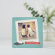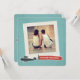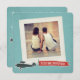 Den här vintagen inspirerade bröllopsinbjudan innehåller ett raster mönster över en reflexblå bakgrund, på vilket det finns ett fyrkantigt pappert ram med utrymme att anpassa sig till ditt eget foto. Grund kant i ram har ett handbildat retroflygplan med en banderoll som lyder "du är inbjuden". Inbjudan är perfekt för destinationsbröllop. Den vita texten på baksidan och placeringen av flygplan och banderollen kan anpassas.