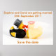 Två söta gula gummi ankor utklädda som brud och brudgum. Två kyssande ankor Save the Date-kort med anpassningsbar text för ditt eget speciella meddelande, namn, spara datum eller lägg till din egen bild.