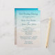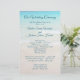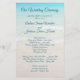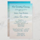 Kant i havet bröllop, utlysningsprogram för strandstider med anpassningsbar på ena sidan. Detta papper är skapat för en enkel kusthändelse och erbjuder tre storlekar och ett urval av matte, satin, filt eller annan papper. Bakgrundsbilden är sand och surfa med blått vatten längst upp på sidan. Elegantens skriptteckensnitt är mörk blått. Omvänd innehåller också en strandbild med ljusare havsblå vatten och slät strandsand.