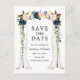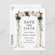 Elegant Bröllop Baldakin Akvarell Rosa Blå Blommig Bröllop Engagemang Annonsering Spara Datum Postkort innehåller vackra rosa rosor och blå rosor. Trä bröllopsbaldakinsbågen innehåller botanisk grönska.