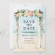 Elegant bröllop Canopy Watercolor Rosa White Blommigt Bröllop Förlovning Announcement Save Datakortet innehåller vackert rosa ros och vit ros. Träets kanopy-båge i bröllop omfattar botaniskt grönt på en sandstrand i blå himmel havsbotten.