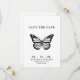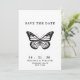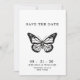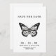 Bröllop Black and White Butterfly Spara datumet. Designer bröllop spara datum-inbjudan med hand plockade (skapat med penna och bläck på papper, sedan digitalt justerad och optimerad för utskrift) svartvitt och svartvit markfjäril. Konstnären och designern inspirerades av det vetenskapliga teckning, bra konstlino-utskrifter och vintage bok-illustrationer och typografi. Utmärkta val för dem som tittar för en unik design. Vi inbjudan besöker vår butik, Austen & Grace, för att visa matchande produkter med mera. Kontakta oss om du behöver hjälp via Zazzles kontaktdesignerknapp eller e-post direkt: contact@austenandgrace.com