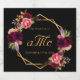 En svart chic med faux guld geometric ram. Dekorerad med mörkens lila och burgundblommor, ro och boho stil fjädrar. Anpassa och lägg till ditt monogram, initialer och ditt bröllop-datum. Din familj namn startar i mitten med huvudstaden brev. Golden färgad brev.
