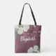 Bröllop Brides Tote Bag-mallar - Elegant Script, Mason Burk, Hydrangea Flowers och String Ljus på Burgundy Red Blommigt Linen Background. En Perfekt för din stora dag! Alla textstorlekar i Stil, Färg kan anpassas efter dina behov.