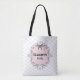 En underbar gåva till bruden, den här designen har en vacker vit bröllop-bakgrund med en rosa-etikett som visar Brides namn i keltiskt typsnitt. Under hennes namn är ett ställe för att infoga "Bride" anpassa din möhippa till väskan i dag!