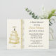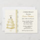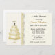 Ett inbjudningskort för möhippan med söt guld bröllop kaka med brud och groom topp med paraply på buff bakgrund. Sida gräns av daisy och bågar.