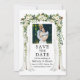 Elegant bröllop Canopy Watercolor Grönt White Blommigt Bröllop Förlovning Announcement Save Datakortet innehåller vackra vit ros och vita peonier. Träets kanopy-båge i bröllop omfattar botaniskt grönt. Lägg till par foto.