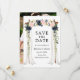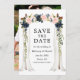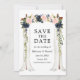 Elegant bröllop Canopy Watercolor Rosa och Dusty Blue Blommigt Bröllop Förlovning Announcement Spara Datakortet innehåller vackert rosa ro och blått ro. Träets kanopy-båge i bröllop omfattar botaniskt grönt. Foto bakåt.