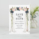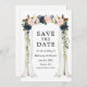Elegant bröllop Canopy Watercolor Rosa och Dusty Blue Blommigt Bröllop Förlovning Announcement Spara Datakortet innehåller vackert rosa ro och blått ro. Träets kanopy-båge i bröllop omfattar botaniskt grönt.