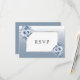 En elegant och enkel OSA kort för ett bröllop med mallar för svar efter datum och namn. En faux silver och vit ram och vattenfärgade blommor i blå nyans. En chic dammig blå övertoning, ombre bakgrund, mörk grått text framtill. Baksida: dammig blå bakgrund, vit brev.