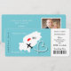 En bröllopsinbjudan för roligt men snyggt i ett boardingkort/biljett stil för par gifta sig utomlands i Ibiza, som visas i en vit karta silhuett på tårblått med sött kärlek-hjärta, flygplanssilhuett och vitt pärlor som snurrar in i en hjärtform. Det omvända är enkelt att anpassa med dina personuppgifter och ett foto av paret lycklig