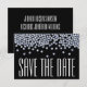 Ett enkelt men vackert modernt bröllop spara datum anmälningskort i svart och vitt med blåa accenter. Överst på kortet finns falska diamant-effekt glittergnistningar.