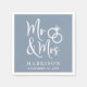 Anpassningsbar dammiga blåblöjor för ditt bröllopsmottagande med "Mr & Mrs" i ett stort vitt skript och en vit illustration av två bröllop ringar gått med ihop. Lägg till efternamn och datum för bröllop.