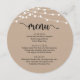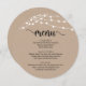 Modern Rustic Brown Kraft, String Ljus, Round Plate Fores, Bröllop elopement Middag, Brunch och Lunch Menu. Ett perfekt-menykort för din stora dag. Du kan ändra skriptteckensnittet färg och ändra menyn innehåll och typsnitt för att uppfylla dina behov.