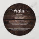 Modern Rustic Cottage Mörk Brown Wood, Round Plate Fores, Bröllop elopement Dinner Menu. En perfekt-meny för din stora dag. Du kan ändra skriptteckensnittet färg och ändra menyn innehåll och typsnitt för att uppfylla dina behov.
