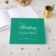 En enkel bröllopsbok med en modern färg, smaragdgrön, och elegant vit kalligrafi.