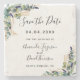 Ett trendig Spara det datum som underlägg för gästerna. Eucalyptus greenery och guldblad. Anpassa och lägg till bröllop-datum, namn och ställe.