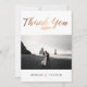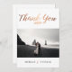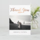 Snyggt bröllop tackar dig för att du har en vykortsmall som innehåller ett foto på framsidan med texten "Tack" i ett modernt skriptteckensnitt i faux shiny guld. Det finns också en liten bladbild under texten i faux guld. Tack för anpassningsbarnas budskap på kortets baksida. Elegant och modern utformning.