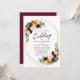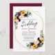 Modern Calligraphy Script, Elegant Watercolor Burgundy Marsala Blommigt Geometric Guld Ram Wedding Investigation omfattar burgundy ro, rosa ros, rödblommor, blåa blommor, solblommor, eukalyptus löv och botaniskt grönämne.