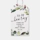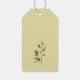 Bröllopsfavoritstaggar för mini vinflaska med vattenfärg botaniska gröna blad med solid solig gul färg på baksidan.