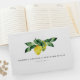 Inbjudan era gäster från bröllop till sitt önskemål och sin visdom med denna botaniska gäst från bröllop bok som har vattenfärgade citroner och löv i gult- och grönt. Datumet namn och bröllop visas under i klassiskt brev. Bok går tillbaka till ett fast Mykonos blå färg. Om du vill se fler botaniska bröllop-formgivningar går du till www.zazzle.com/dotellabelle