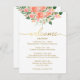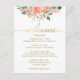 Ett vattenfärgskort i rosa ros för att välkomna gästerna i bröllop och informera dem om din planerade färdväg. Ett kompakt kort som kan läggas till i en förmånspåse med ett modernt teckensnitt i faux guld. Faux guld färg kommer från skrivaren bläck och är inte metallisk eller formad.