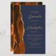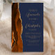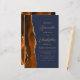 Den vänstra kanten på denna eleganta moderna bröllopsinbjudan har en bränd orange akvarell-agat-kant med falskt guldglitter. Den anpassningsbara texten kombinerar guldfärgad script och sans serif-teckensnitt på en marinblå bakgrund. En matchande bränd orange agat-design visas på baksidan av kortet.