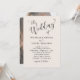 Gör ett bestående intryck med inbjudan till elegant bröllop, som innehåller "Bröllop av" i ett romantiskt skript som vackert parats med ett fet, traditionellt teckensnitt för ett tidlöst och sofistikerat utseende. Den rena monokroma konstruktionen utesluter klass och förfining, perfekt för en contemporary eller klassisk firande. I motsatt riktning anpassar du dig med ditt favoritpars foto och monogram, som är överlagrad med en mjuk vit övertäckning, vilket ger ett unikt och sentimentalt tryck på ditt bröllop-kontor. Den här inbjudan förenar utan problem stil och skapar det som en perfekt för din speciella dag.