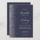 Den här elegantens lämnat kant har en modern bröllopsinbjudan i silver i glitter. Med anpassadet kombineras handskrift, tryckplåt och kursivt typsnitt med silver grått mot en mörk blått bakgrund. Den omvända sidan ger plats för bröllop-information på en solid mörk blått bakgrund, tillsammans med en QR-kodgäst som kan söka på din webbplats och OSA, vilket sparar kostnaderna för utskrift och utskick av separat OSA kort.
