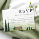 Tusanskt landskap med en villa och cypress-OSA kort. Transport dina gäster till den toskanska Italiens andningslandskap, till och med före bröllopsdagen, med den här OSA kort med en vattentät vattenfärg. Kortet har en fängslande återgivning av regionens landskap, komplett med sitt särskilda rullande backe, cypress och skorstensbyar. Kortet är avsett för gäster som ska svara med sin närvaro och ger en förhandsvisning av det fantastiska målet och återspeglar den romantiska inspiration som framkommit av Toscanas skönhet.