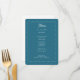 Det här moderna och fetstilta menykortet i rundad form har ett vågformat ram, återinspirerat skripttypsnitt och din middagsmeny eller bröllop-meny på Teal Blue-bakgrunden. Perfekt för ett modernt bröllop eller någon annan elegant händelse. På baksidan finns plats för datumet namn och bröllop - eller ta helt enkelt bort texten på baksidan. Hela färger på det här bröllop-menykortet - bakgrund, text och påfyllnad i ram färg - kan ändras i verktyg.