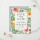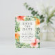 Ställ in tonen för det tropiska temat bröllop med denna pulserande vattenfärg hibiscus och tropiska blad Spara datumkortet. Det är ett val av perfekt för strandbröllop, målbröllop, tropiskt tema bröllop med mera. Anpassa med namn, datum och plats för bröllop genom att redigera exempeltexten i designmallen för enkel använda. Aloha!