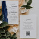 Den moderna bröllopsinbjudan från elegantens lämnat kant har en marin blå vattenfärgsagat gräns som trimmas med faux silver glitter. Anpassadet kombinerar grått-skriptet för kol och sans serif typsnitt på vit bakgrund. På baksidan finns utrymme för information om bröllop, tillsammans med en QR-kodgäst som kan söka på webbplatsen och OSAN, vilket sparar kostnaderna för utskrift och utskick av separat OSA kort.