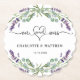 Vit bakgrund, svart text. Dekorerad med lavender-blommor och eukalyptus greenery. Mr och Mrs med hjärta. Anpassa och lägg till namn och datum.