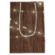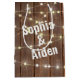 Glödande bröllop vita ljussträngar och brud och groom namn på den jorda träbakgrunden. Bakgrunden till färg kan ändras. Namn kan redigeras.