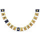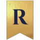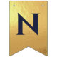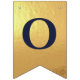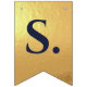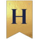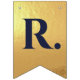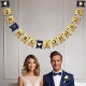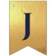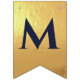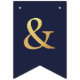 En flaggor banner för ett bröllop med marinblå och guld bröllopsfärger, med orden "Herr. & Fru" och familjenamnet för det nya paret och 3 hjärtan. Texten är i marinblå versaler på falskt guld folie bakgrund, hjärtana och et-tecknet är falskt guld folie på marinblå bakgrund.